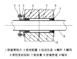 過鋼套管,然后把活動壓蓋插入鋼套管組合,擰上螺桿,擰緊螺母,使項壓套管壓緊橡膠密封圈,橡膠密封圈經受壓迫產生交形,與鋼套管內壁及穿墻管道外壁