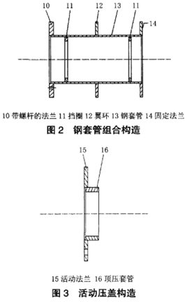 活動壓蓋由活動法蘭焊接頂壓套管構成。頂壓套管的右端處在鋼套管組合與穿墻管道之間且端頭與密封膠圈貼合連接。通過使用該種活動壓蓋,可以使其在